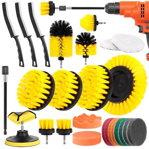CIRULLI 27-delad borstfästborrmaskinuppsättning, rengöringsborste elektriskt, fälgborstpaket för borrmaskiner, fälgar, fogar och hörn, borste för kök, badrum och bil, gul