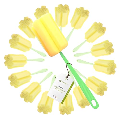 Gadget-Hero rengöringsborste för flaskor set om 15 – flaskborste svamp – disksvamp för glas – reptålig flaskrengöring med långt handtag – flasksvamp – rengöringsmedel för babyflaskor