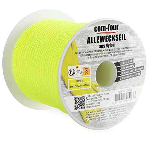COM-FOUR® paracord lina Ø 3mm, 50m - rep med 3 kärntrådar för båt, camping, utomhus - nylonrep med 192 kg lastkapacitet - tältrep, grenrep, universalrep