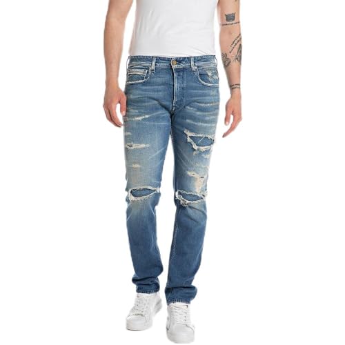 Replay Grover Broken Edge Jeans för män, 009 medium blå, 34W / 32L