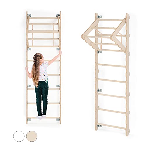 Ribbstol, barnrum, gym vägg, barn, småbarn | Klätterställning inomhus, gymnastikvägg av naturligt trä (210 cm) | Gymnastikringar barn med repstege, gunga | 100 % ECO | tillverkad i EU