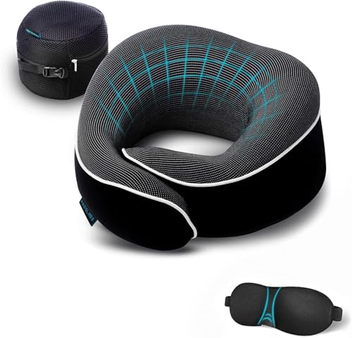 Proglobe Resekudde set med 100% Pure Memory Foam, Nackkudde för sömn, bil och flygresor, Rese-kit med 3D-konturerad ögonmask och lyxig meshväska (Svart)