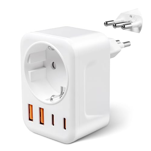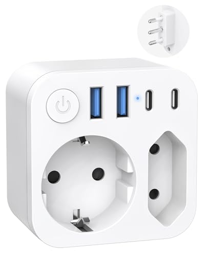 Strömförsörjning från Tyskland till Italien med 4 USB (2 typ C), reseadapter med 2 fack för Italien, Schuko-resekontakt med L-typ, vit