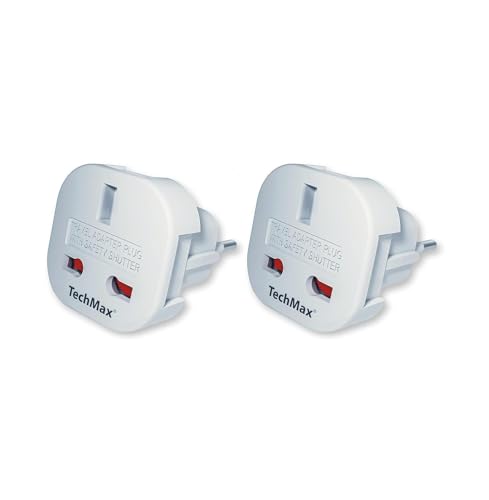 TechMax paket med 2 UK till europeisk kontaktadapter typ G till typ C, E, F för Frankrike, Spanien, Turkiet, Italien, Grekland, Portugal, Tyskland, Polen, Asien – 3 stift till 2-polig reseadapter