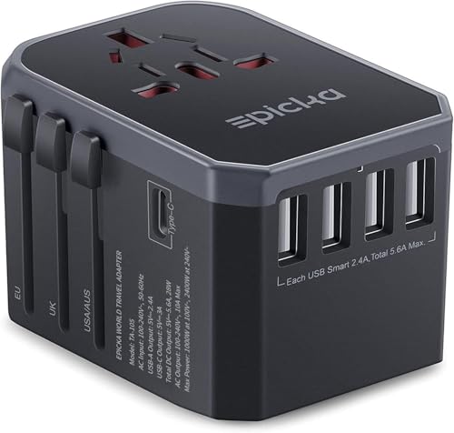 EPICKA Universal reseadapter, Internationell Uttagsadapter 28W, Reseadapter över Hela Världen med 1-USB-C, 4-USB-A för Italien England Amerika Australien Japan (TA-105, Grå)