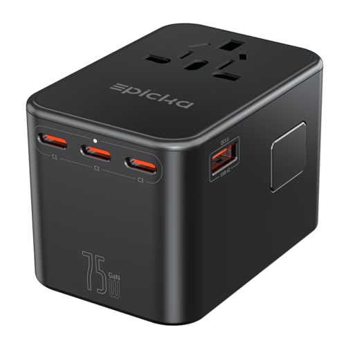 EPICKA GaN Universal Reseadapter Snabbladdning, PD 75W Internationell Reseadapter med 3 USB-C, 2 USB-A, Världsomspännande Reseadapter för Japan, Amerika, Thailand, Storbritannien DE, TA-105 Max