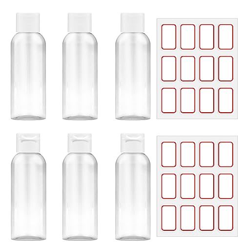 JamHooDirect 6 st 50 ml tomma reseflaskor i klar plast med flip-keps, genomskinliga påfyllningsbara kosmetiska behållare klämbara rör innehåller 12 klistermärken för schampo, balsam, lotion,