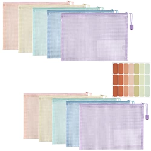 HEETA Blixtlåsmappar A4, 12-pack robusta plastplånböcker vattentäta nätväskor med säkra dragkedjor för kontor, skola, hem, reseförvaring, 6 Macaron-färger