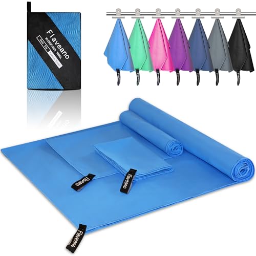 Flaveano Microfiber Handduk, Resehandduk set om 3 (180x90cm, 80x40cm, 50x30cm), snabbtorkande för camping, simbassäng, strand, gym och sport - Blå