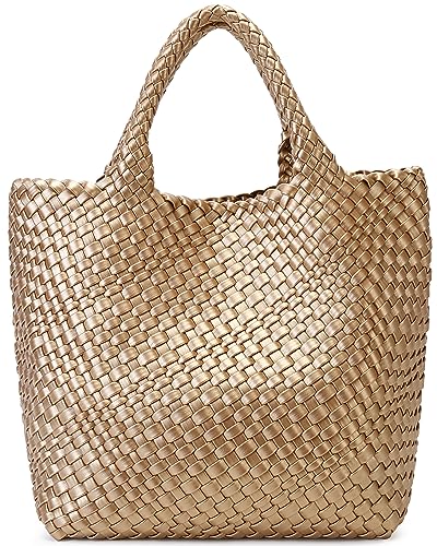 Queenoris vävd väska för kvinnor, tygväska i veganskt läder, stor, sommar, strand, resehandväska och handväska, retro, handgjord axelväska, GYLLENE, Large