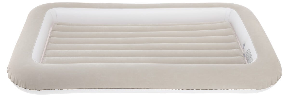 The Shrunks® Uppblåsbar resesäng för barn med fallskydd – flockad luftmadrass för resor, övernattningar, camping – vit/brun sidosäng på hotell eller hemma 152 x 94 cm