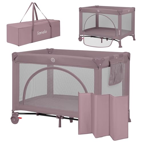 LIONELO Laura Resesäng och Lekhage 2-i-1 Hopfällbar (0–36 mån/upp till 15 kg), Kompakt 102x72 cm, Madrass och Transportväska Ingår, 2 Nivåer, Meshsidor, Sidoingång, Hjul med Broms, Rosa