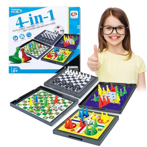 Saijer Snakes and Ladders, 4-i-1 resespel magnetiskt spel minischack spelsamling barn resespel magnetiskt bärbart multifunktionellt ormschack flygschack vikbart brädspel för bilresa
