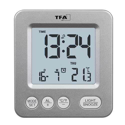 TFA Dostmann digital radio reseväckarklocka, 60.2567.54, inomhustermometer, kalendervisning (datum + vardag), snooze-funktion, radioklocka, silver