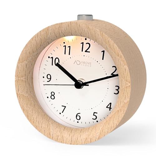 aboveClock väckarklocka analog utan tickande, trä med snooze, sängbordsklocka med nattljus, reseväckarklocka batteridrift – naturligt trä i ljusbrunt