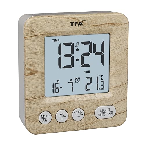 TFA Dostmann Digital trådlös väckarklocka med träutseende, 60.2567.08, radioklocka, reseväckarklocka, veckodag och datum, larm, med tidszoner, batteridriven, trä, brun