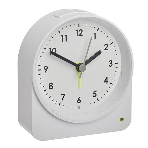 TFA Dostmann analog väckarklocka, 60,1041.02, utan tickande med Sweep-urverk, med bakgrundsbelysning/ljussensor, reseväckarklocka och bordsklocka, med sekundvisare, kvartsur, 10 cm x 9,1 cm, vit