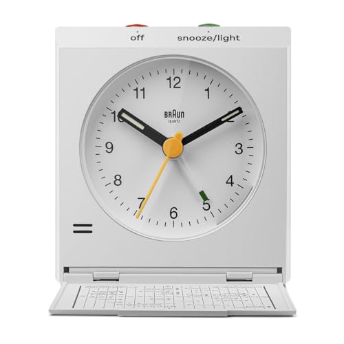 Braun klassisk analog reseväckarklocka med snooze och ljus, ikonisk design, kompakt storlek, vikbart lock med världskarta, tyst kvartsrörelse, Crescendo pip alarm i vitt, modell BC05W