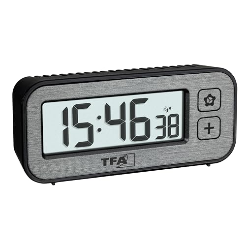 TFA Dostmann trådlös väckarklocka digital med temperatur och luftfuktighetsväxel, 60.2522.10, med högsta och lägsta värden, med larm och radioklocka, reseväckarklocka, liten, icke-tickande (grå)