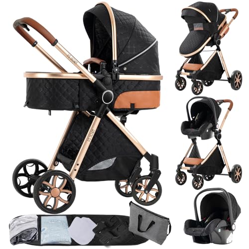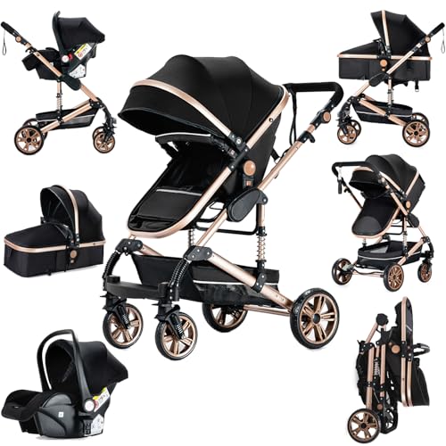 3-i-1 kombibarnvagn med resesystem, standardbarnvagn, barnvagn, buggy, nyfödd, bärbar resevagn, vikbar, high landscape-barnvagn (739 svart/guld)