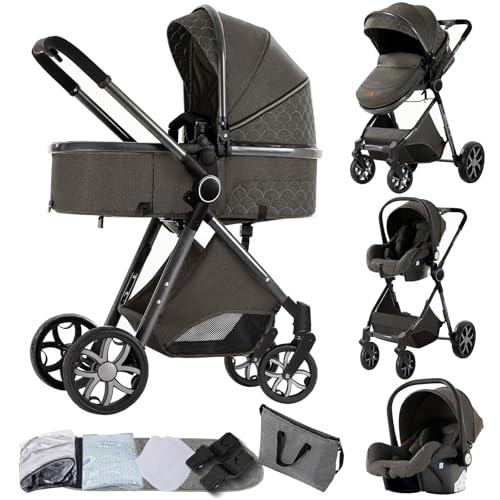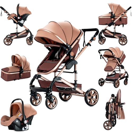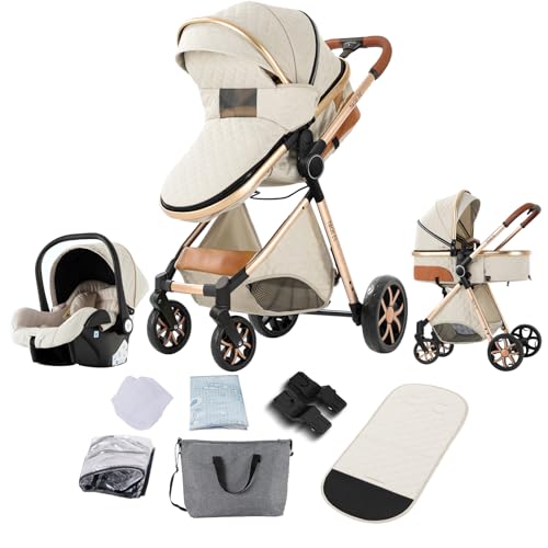 3-i-1 kombibarnvagn med resesystem, standardbarnvagn/barnvagn/buggy för nyfödda, bärbar och vikbar resevagn, high landscape-barnvagn (739 beige)