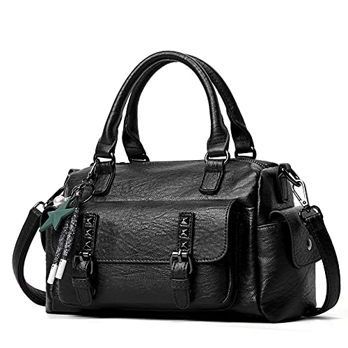 PORRASSO Retro handväska axelväska för kvinnor med hänge vattentät axelväska, PU-läder messenger väska, arbete, resor, dating Boston väska, Svart, L