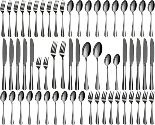 Bestick set 12 personer, Hunnycook 60 delar, svart med gafflar, skedkniv, rostfritt stål, svarta bestick för hem, restaurang, utomhus, högglanspolerad, diskmaskinssäker