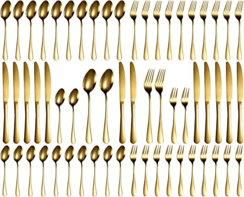 Bestick set 12 personer, Hunnycook 60 delar bestick guld matt med gafflar skedkniv, rostfritt stål gyllene bestick för hem/kök/restaurang, högglanspolerad, diskmaskinssäker