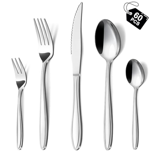 Hunnycook Bestick set 12 personer, 60 delar rostfritt stål matbestick med linjehandtag, elegant bestickset med kniv gaffel sked för hem/restaurang/fest, diskmaskinssäker