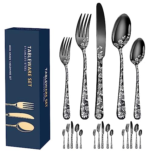 Aoresac Bestick Set 4 Människor,20 PCS Rostfritt stål Bestick Set Polerat Mönster Med Blomsterspegel Inkluderar Kniv, gaffel, Skjortor för matlagning Restaurang Party, Svart