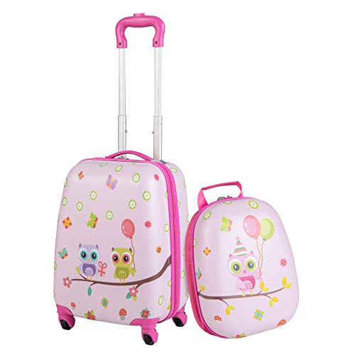 GOPLUS Barnresväska med ryggsäck, bagageväska för barn med hjul, resväska med teleskophandtag och hårt skal för barn, barnväska, färgval, Rosa uggla, 12"+16"