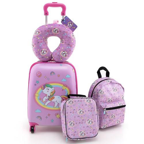 FANTASK 5 TLG Barnväska, barnbagage med ryggsäck och matlåda, bagageetikett & nackkudde, barnvagn med hjul, handbagage resväska hårt skal för barn från 6 år (enhörning), Enhörning, 30 cm x 23 cm x 53