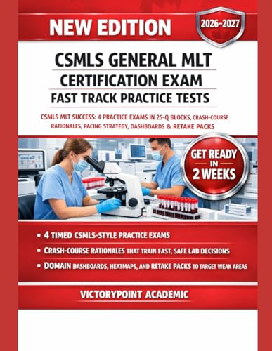 CSMLS GENERAL MLT CERTIFICATION EXAM FAST TRACK PRACTICE TESTS: FAST-TRACK CSMLS MLT SUCCESS: 4 PRACTICE EXAMS IN 25-Q BLOCKS, CRASH-COURSE RATIONALES, PACING STRATEGY, DASHBOARDS & RETAKE PACKS