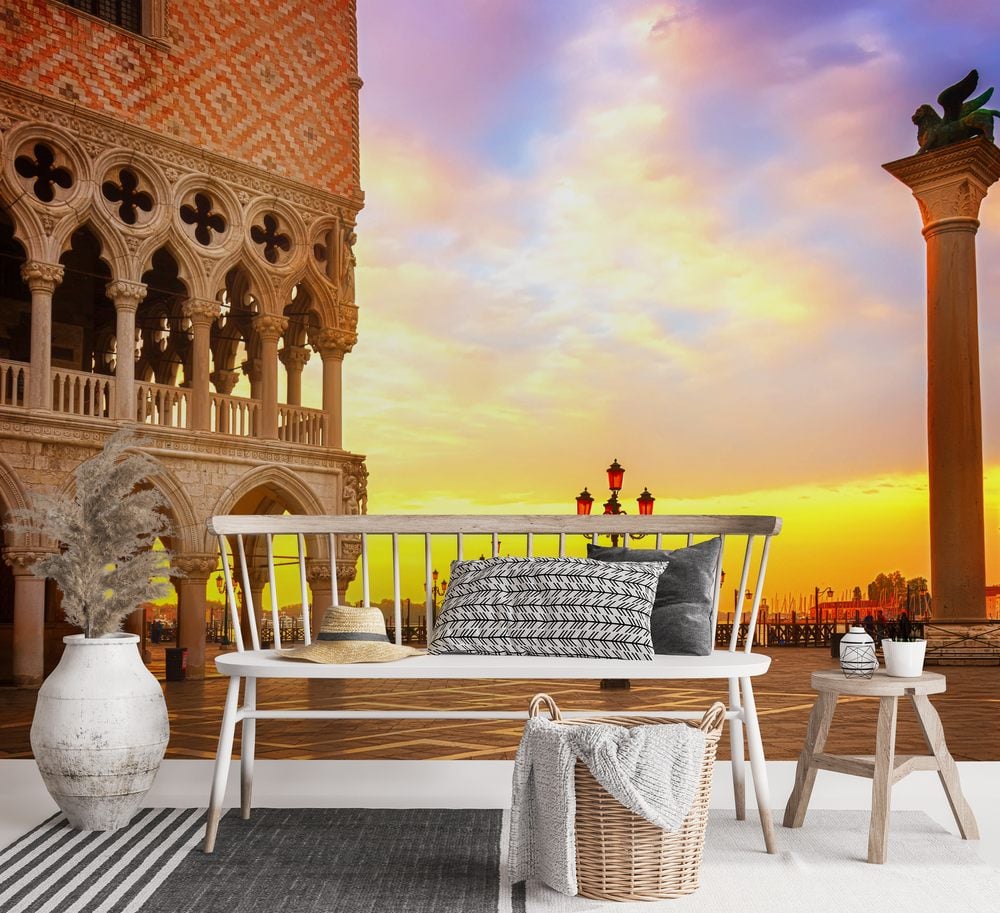 Fototapet -Famouse Doge palace column with winged lion and San Marco square at sunrise Venice Italy retro toned - Hall - Scandiwall - Venedig