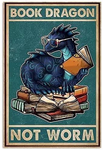 Dragon Retro metall plåtskyltar bok drake not worm rolig affisch bibliotek café vardagsrum badrum kök hem konst väggdekoration plakett gåva 20 cm x 30 cm