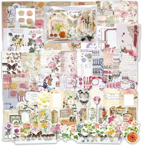 Carreuty 290 st estetiska scrapbooking-klistermärken papperspaket, gör-det-själv dekorativa retro blommor journalföringstillbehör kit för scrapbook-journal (retro blomma liv)