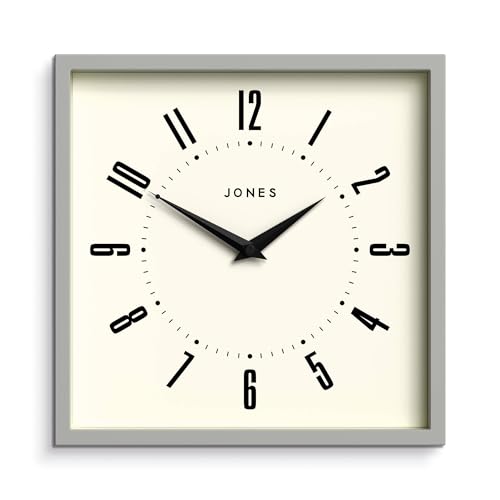 Jones Clocks® Box retro urtavla väggklocka – fyrkantig klocka – köksklocka – kontorsklocka – retro klocka – designerklocka – färgglatt fodral – arabisk siffra urtavla (peppargrå)