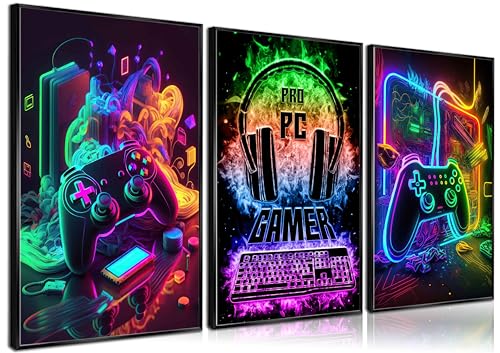 Dekorativa väggaffischer, 3 stycken, cool, retro, akvarell, tv-spel, gaming, bilder, färgglad, neon, kanvas, målning, tryck, för pojkrum, barn, spelrum, sovrum, heminredning, 40 x 60 cm