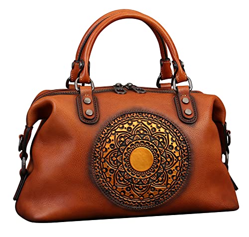 Genuine Leather Women's Handbags Travel Small Purses Top Handle Barrel Satchel Shoulder Hand Bags leather crossbody bags for Women Retro Totem Tote Bag Brown