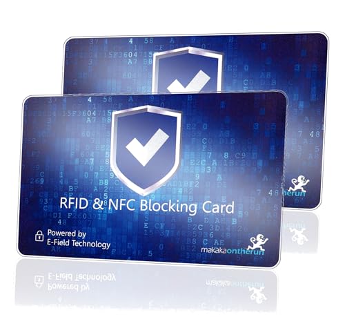 MakakaOnTheRun DEKRA + EMV testad. RFID-blockerare kort 360° RFID skydd störsändare elektronik – NFC-blockerkort – skyddskort för stor plånbok – skyddskort mot dataklock – RFID-blockerkort, 2 x
