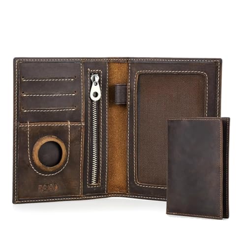 Kontakter Män Passplånbok äkta läder RFID-blockerande handväska med AirTag-fack kortarrangör smal koppling för familjeresor, Mörkbrun-s, Carry 1-4 passport, Retro