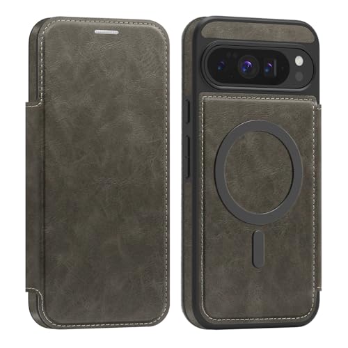 QYFCOU Fodral för Google Pixel 10 Pro XL - flipfodral kompatibelt med MagSafe, PU-läder med korthållare och RFID-skydd - grå