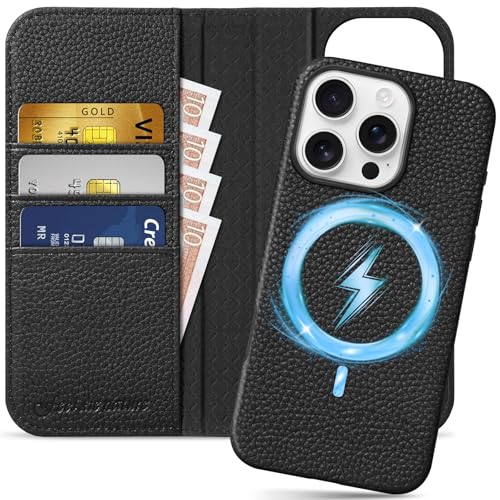 SHIELDON Avtagbart fodral för iPhone 16 Pro, magnetiskt skyddsfodral med korthållare i äkta läder [RFID-blockering] [heltäckande skydd] läderfodral, kompatibelt med iPhone 16 Pro, svart vete-litchi