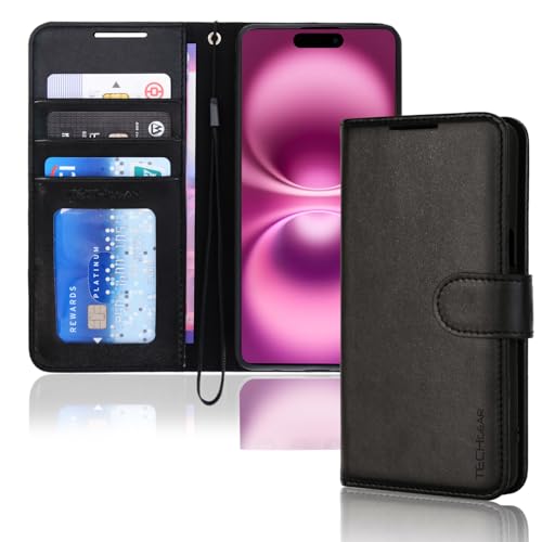 TECHGEAR iPhone 16 läderplånboksfodral, skyddande flipfodral skydd med [RFID-blockering] plånbok korthållare, stativ och handledsrem – svart PU-läder med magnetisk stängning för iPhone 16 6,1 tum
