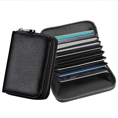 Korthållare med dragspel i läder med dragkedja, plånbok med dragkedja, kreditkortshållare, plånbok för män och kvinnor med NFC-RFID-skydd, 12 kortplatser och 2 fack, Svart, 10.5cm, Klassisk