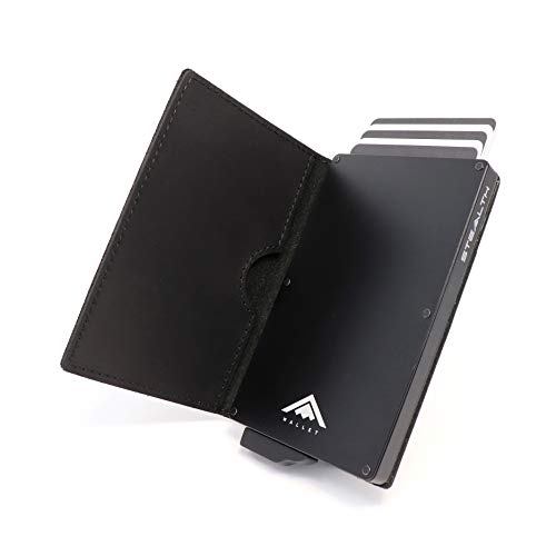 Stealth Wallet RFID Korthållare Plånbok - Smart Minimalistisk Pop Up Plånbok med Presentlåda - Slim Lättviktiga Metalkorthållare för Män & Kontaktlös Skydd (Svart Aluminium, Svart Crazy Horse Läder)