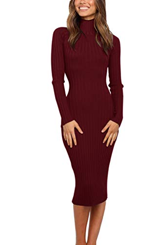 MEROKEETY Women's 2025 Ribbed Long Sleeve Sweater Dress High Neck Slim Fit Knitted Midi Dress, Wine, S