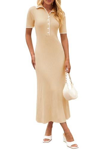 MEROKEETY Women's V Neck Ribbed Knit Maxi Dress Button Short Sleeve Slim Fit Bodycon Sweater Dress, Apricot, Large