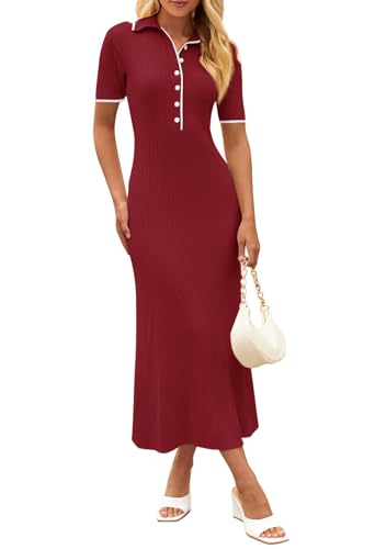 MEROKEETY Women's V Neck Ribbed Knit Maxi Dress Button Short Sleeve Slim Fit Bodycon Sweater Dress, Wine, Medium