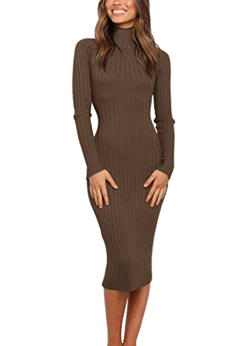 MEROKEETY Women's 2025 Ribbed Long Sleeve Sweater Dress High Neck Slim Fit Knitted Midi Dress Coffee